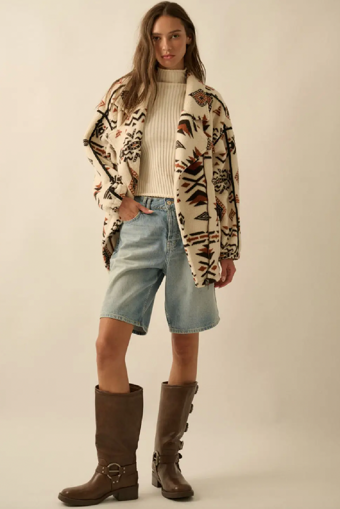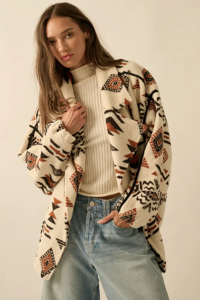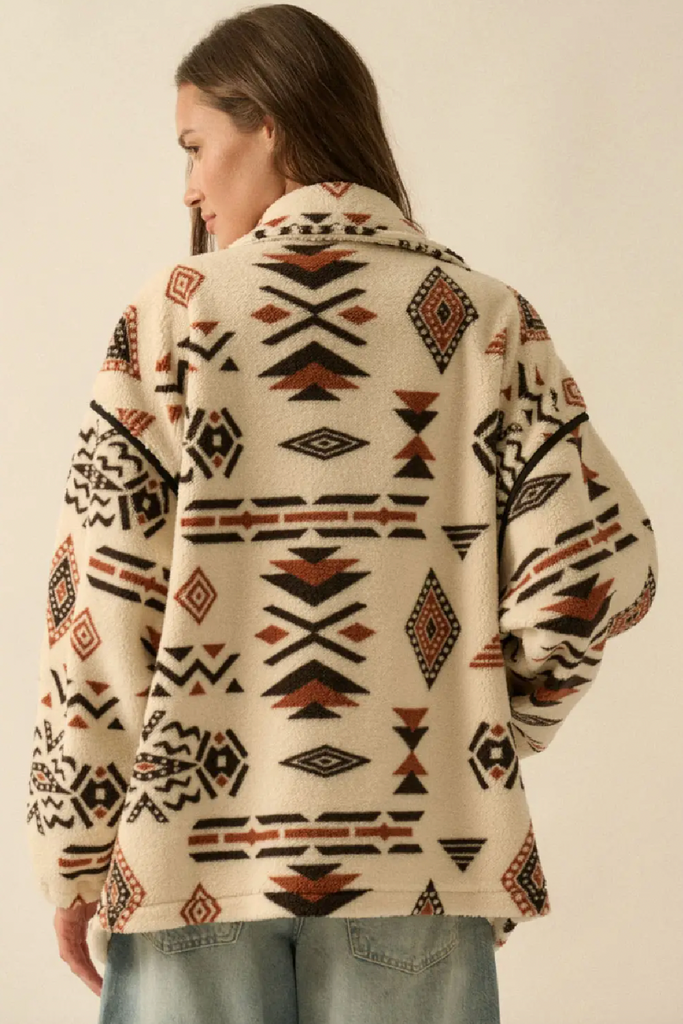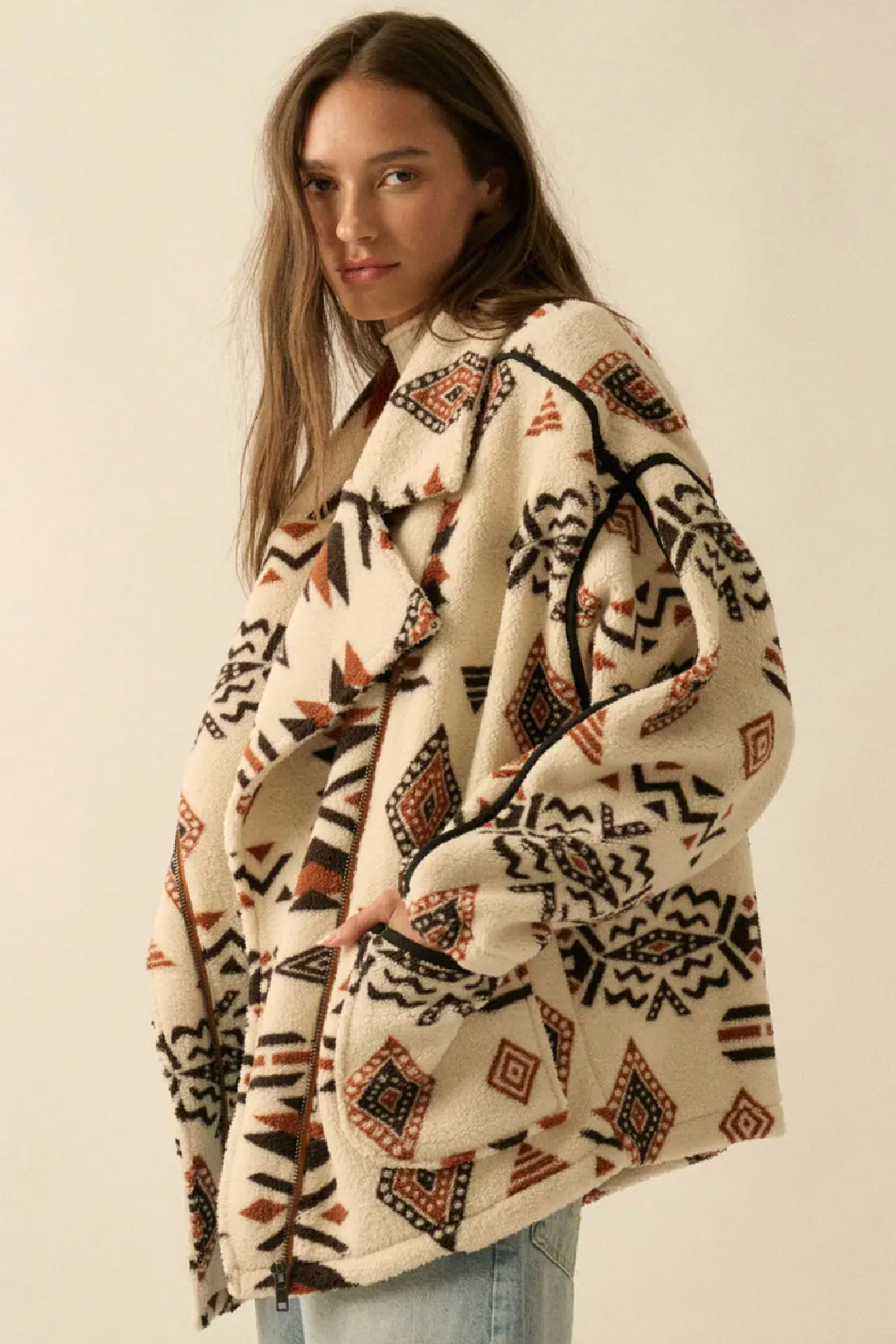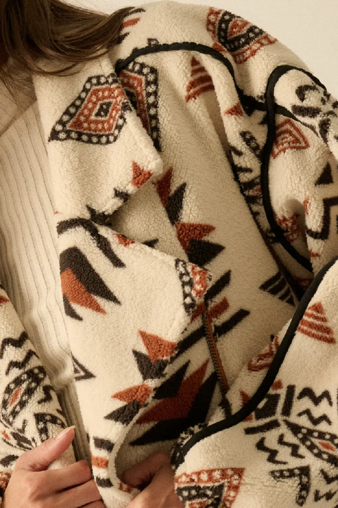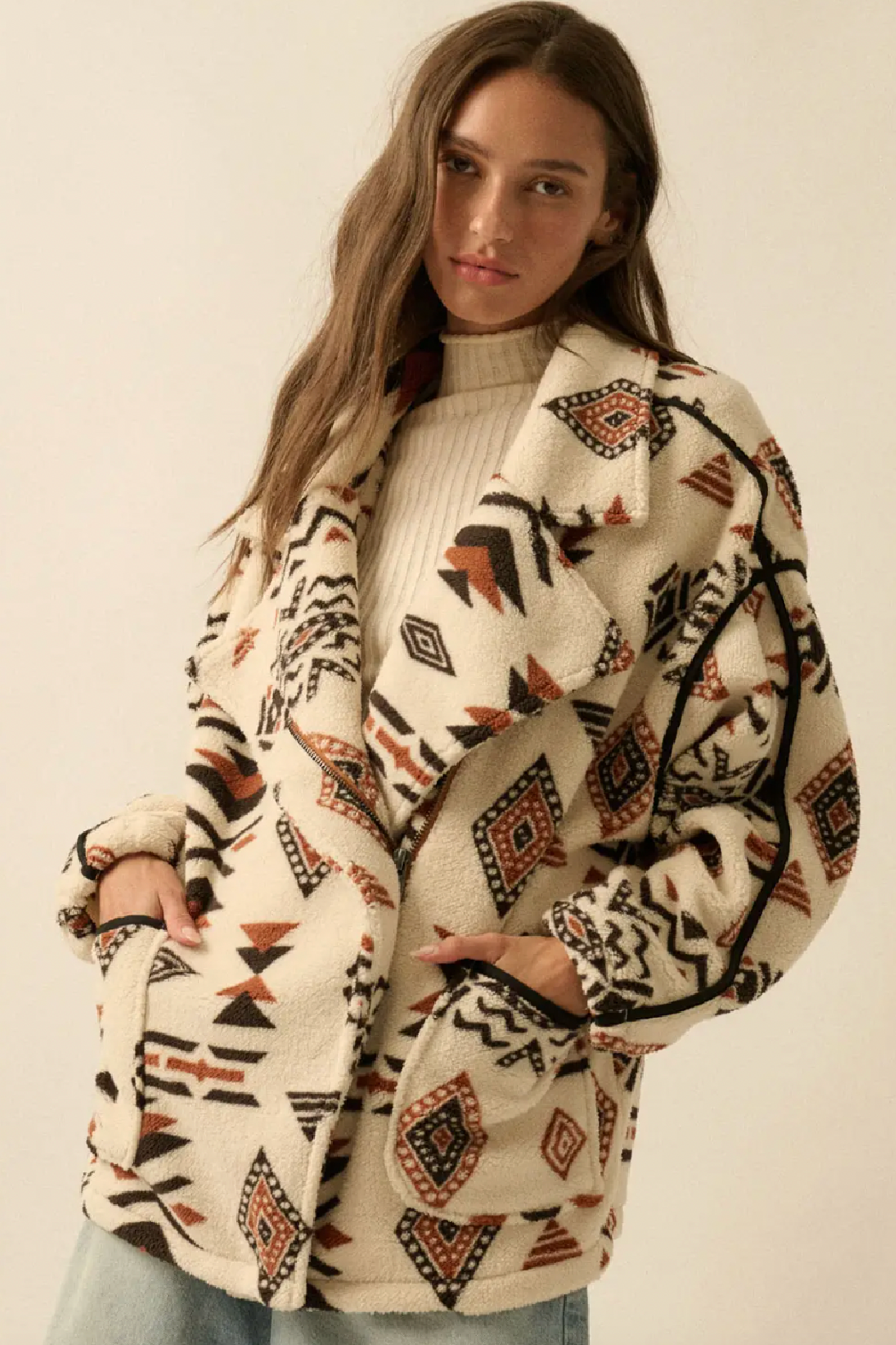 Geo-Print Sherpa Fleece Zip-Up Lapel Pocket Jacket