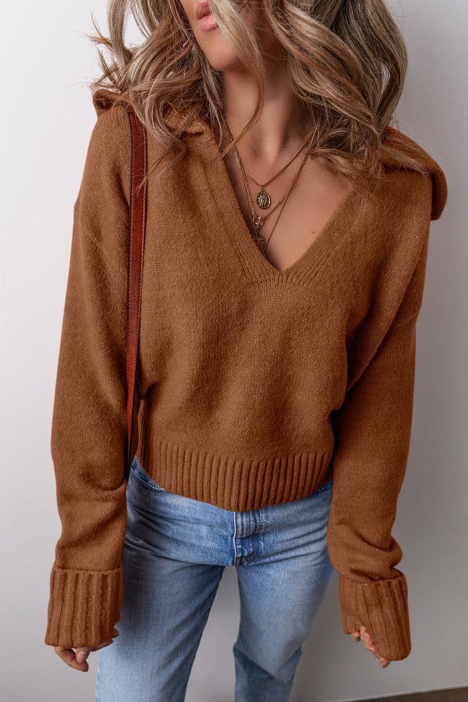 Chestnut Ribbed Edge Collared V Neck Loose Fit Sweater
