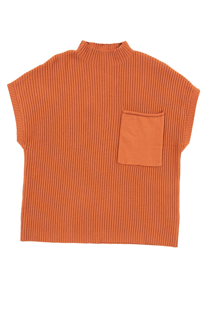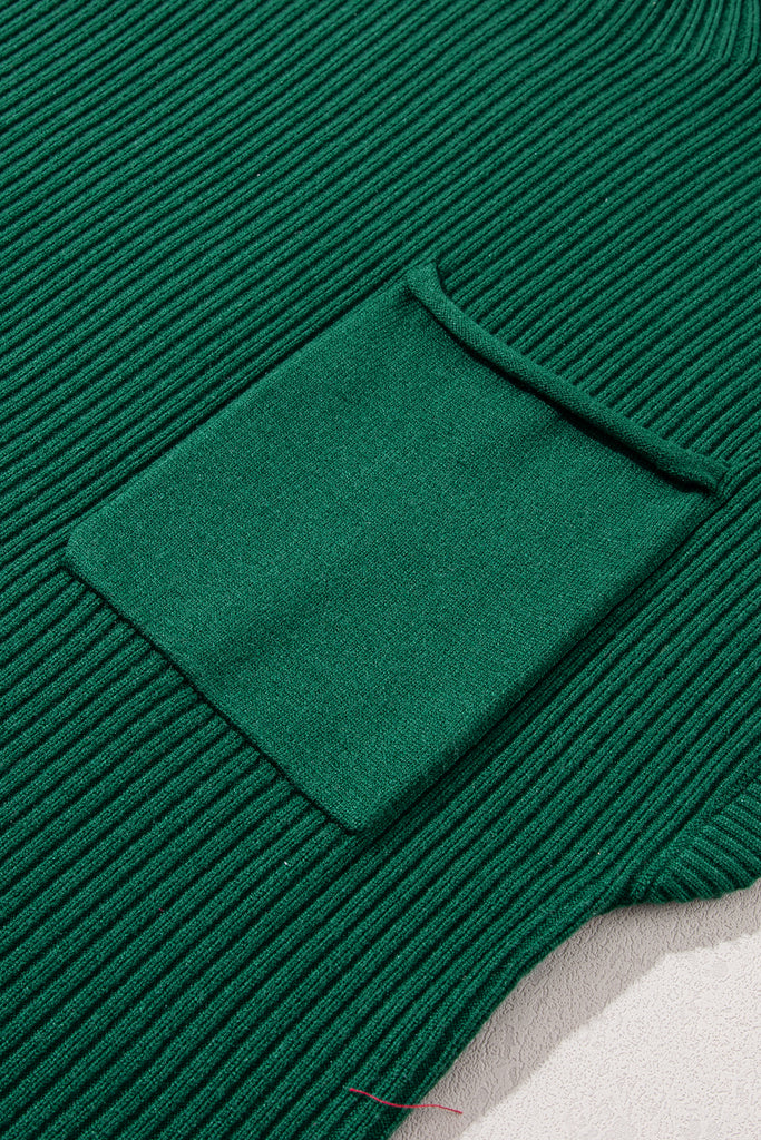 Green Patch Pocket Ribbed Knit Short Sleeve Sweater