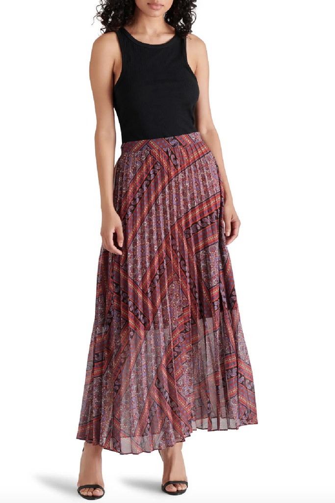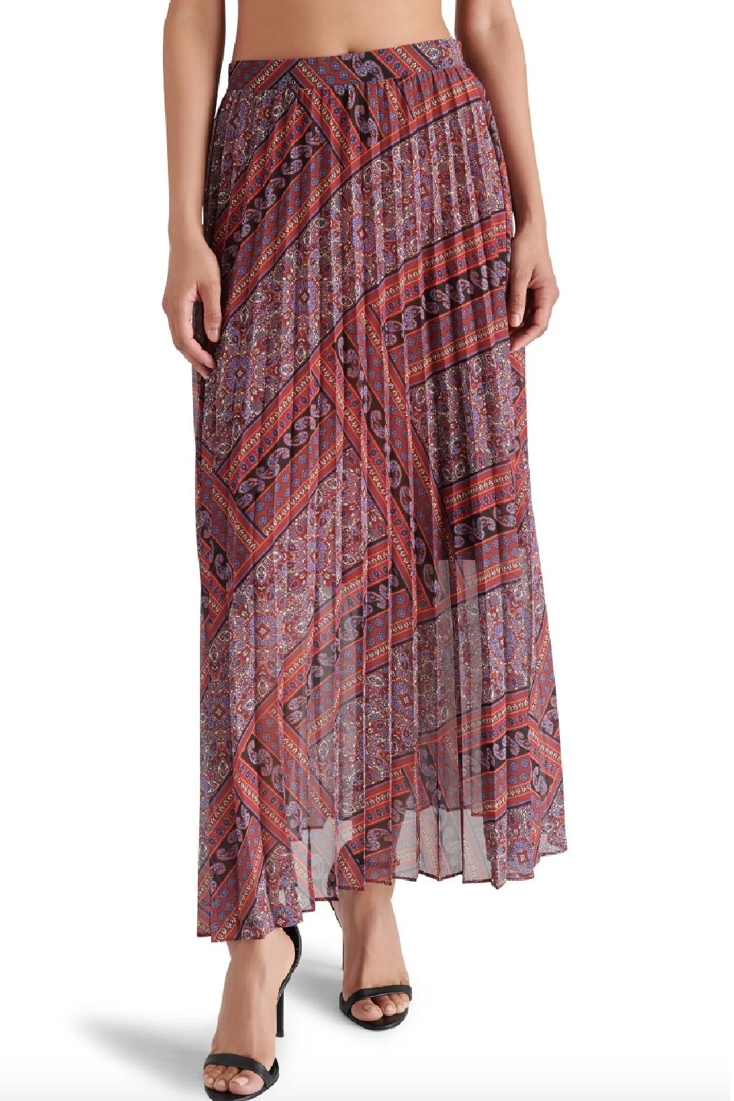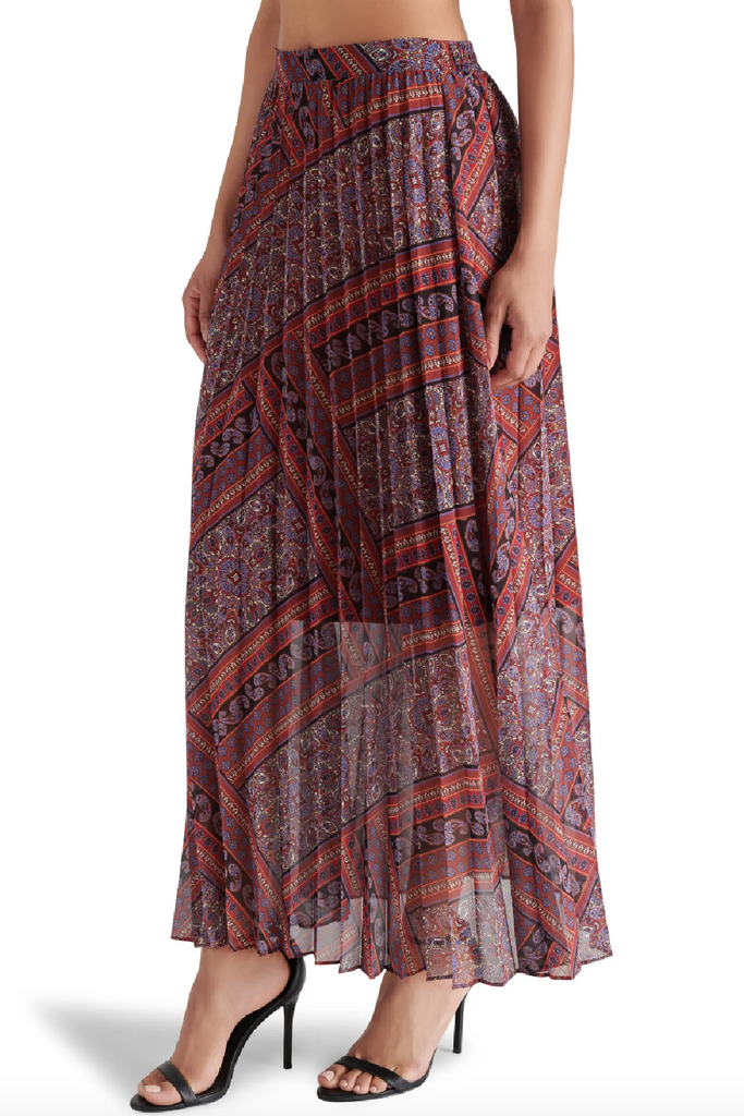 Boho-inspired paisley print artfully adorns this flowy chiffon maxi skirt textured with soft pleats that effortlessly sway with your every move.