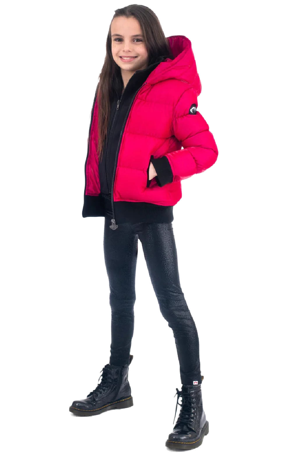 Introducing Appman's Flurry Coat for girls! Stay stylish and warm this winter with its hood, pockets, and warm lining. The double zip ensures extra protection against the cold. Available in Shiny Black, Fuchsia, and Silver, these coats are reflective and eye-catching. Perfect for any winter adventure!