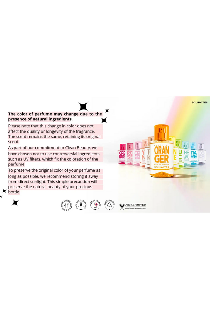 Solinotes is here to break the rules of pricey high-end French perfumes. Spray on good vibes with a rainbow palette made from super ingredients to elevate the mood. Our perfume does not just smell good but puts you in touch with your emotions, your personality, revealing nothing but the essential: you!